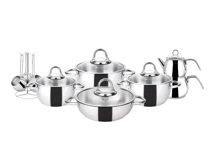 L'ensemble de batterie de cuisine Karaca Granada est un ensemble complet. L'ensemble se compose d'un ensemble de 4 casseroles avec leur couvercle en verre, d'une théière à double étage, d’un set de 3 cafetières turques. Dans cet ensemble vous aurez tous les incontournables de la cuisine.