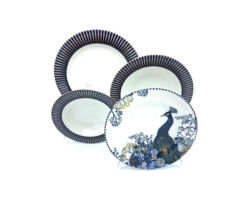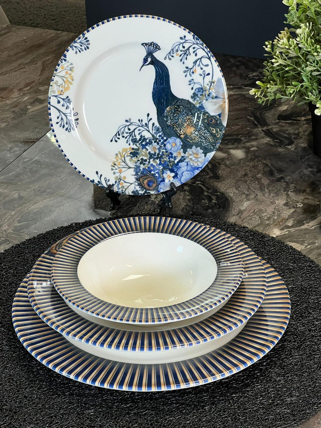 Les motifs géométriques sur les bords offrent un point fort visuel qui est souligné et complété par le motif de paon filigrane sur l'une des assiettes.