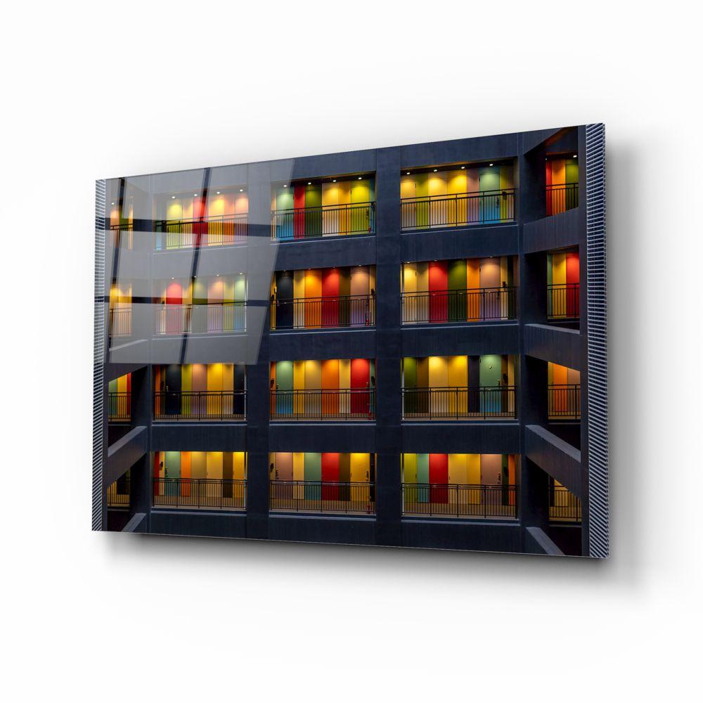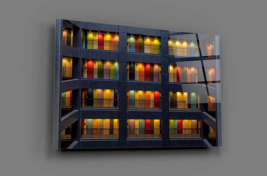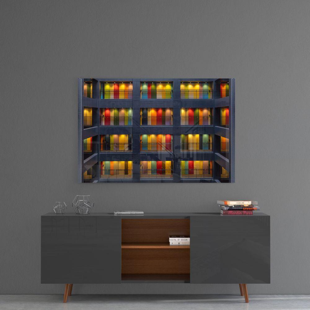 Cette œuvre d'art montre un immeuble avec ses portes, ses couloirs multicolores et ses balcons frappants, éclairés par un atrium ouvert.